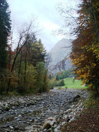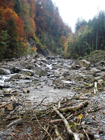 as Bachbett der Engelberger Aa fasst leer und mit viel Holz.