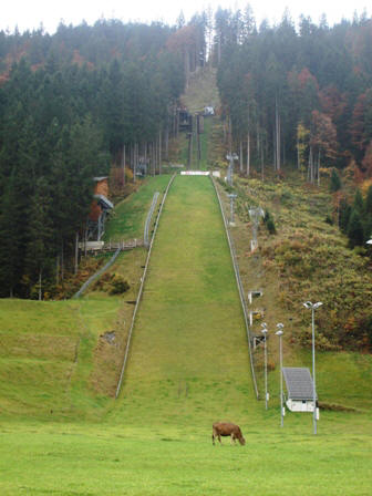 Die Titlisschanze im Herbst. Frisst die Kuh die 4-Blättigen Kleeblätter, welche den Sportlern Glück bringen?