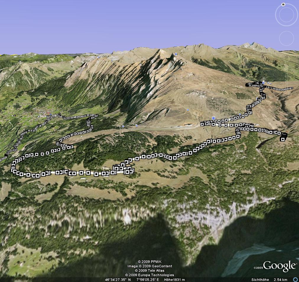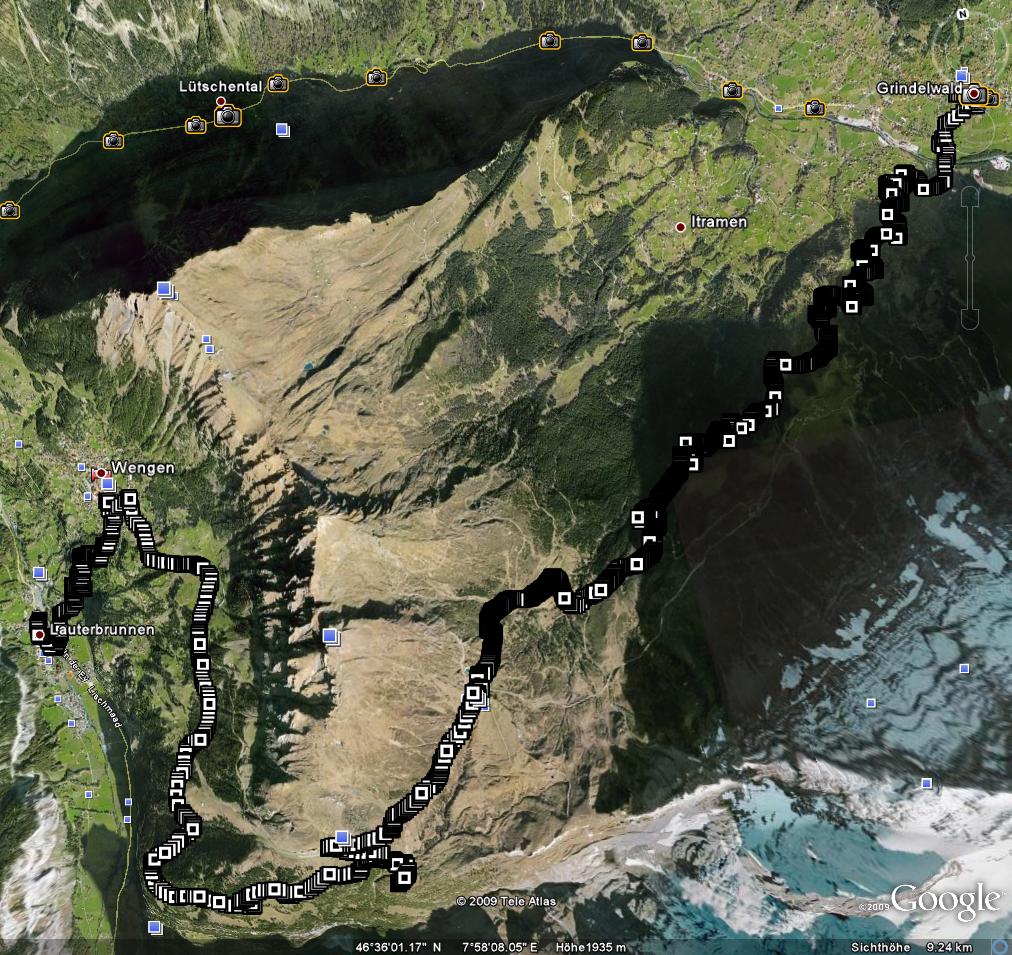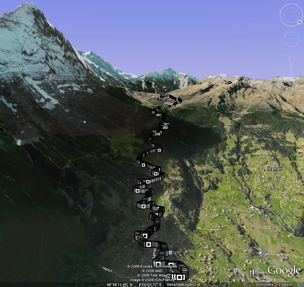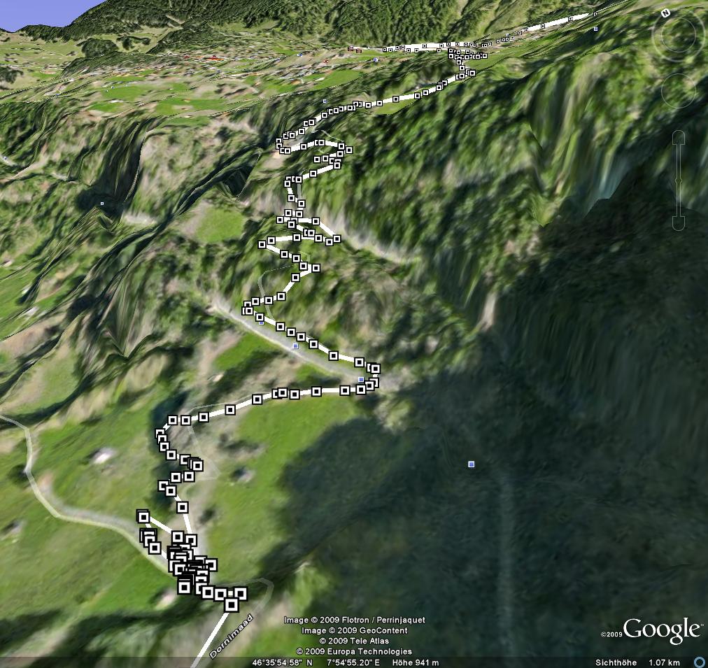 Der Serpentinen Downhill nach Lauterbrunnen. Dort wo die vielen Punkte sind, ist die Unfallstelle mit ohne Bremsen... |