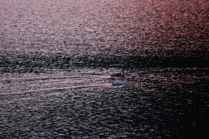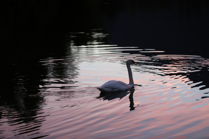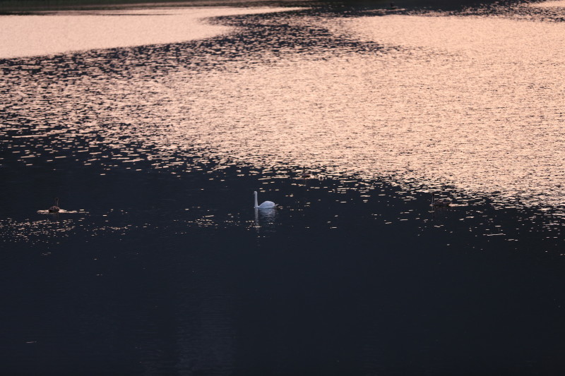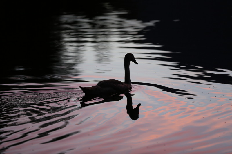 Weisser und schwarzer Schwan schwimmen in den Abend