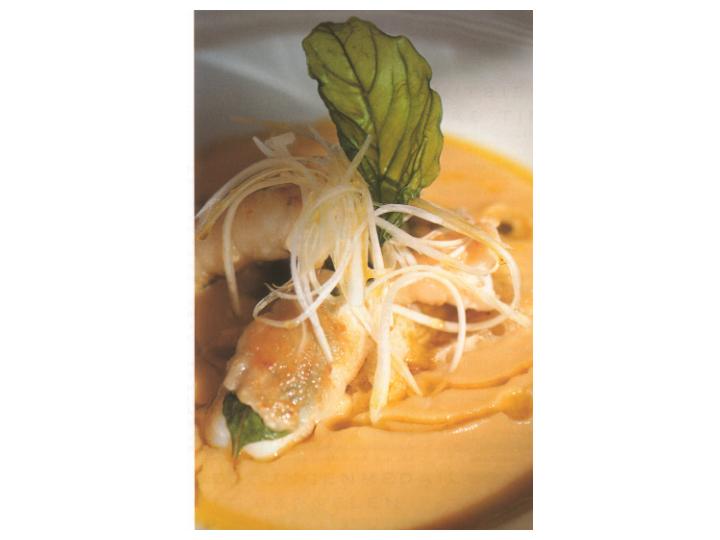 in die Mitte je 3 Scampi setzen, mit hauchdünnen Zwiebelstreifen