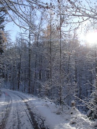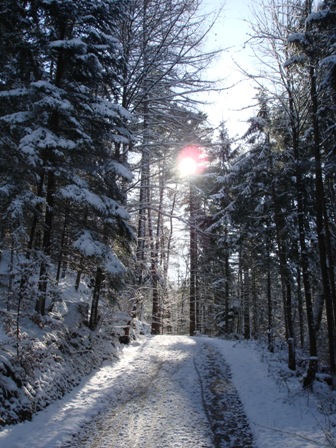 Verschneite Waldwege mit Sonnenlicht und Wegweisern um das Esterli.